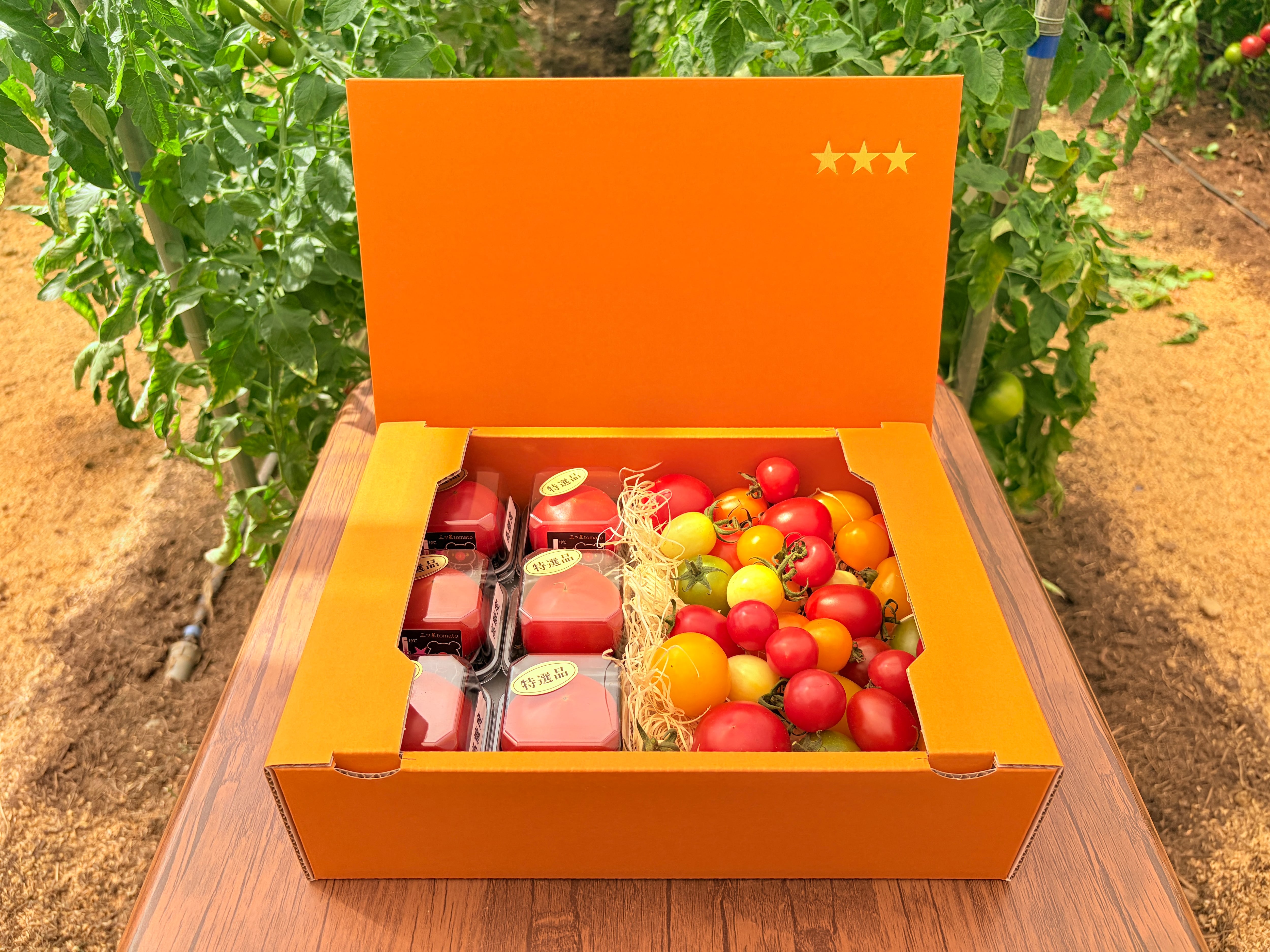 ひとつずつ個包装された「糖度9度以上の特選トマト」と個性豊かな「11種類のカラフルなミニトマト」。箱を開けた瞬間の歓声が約束された、最も華やかなギフトセットです。